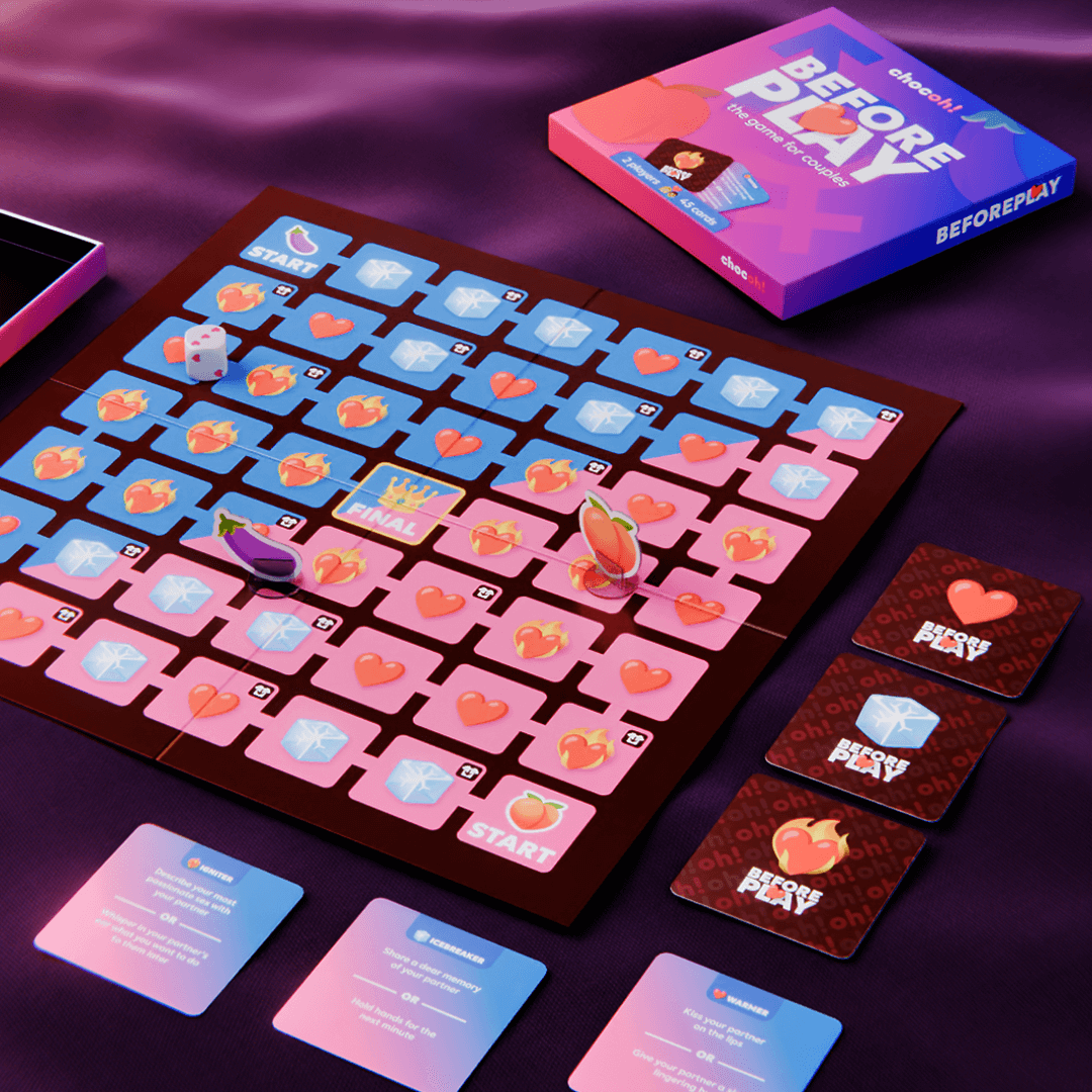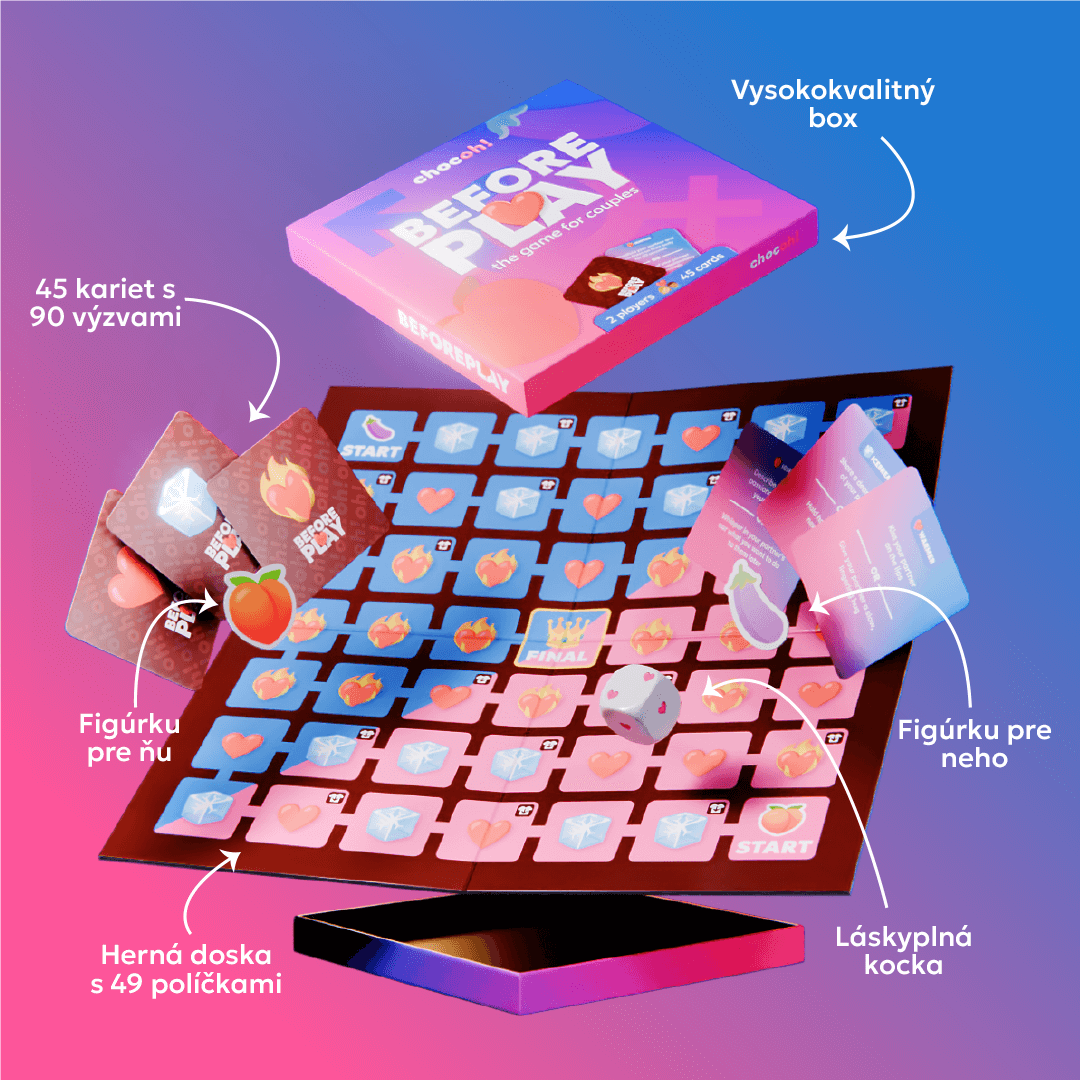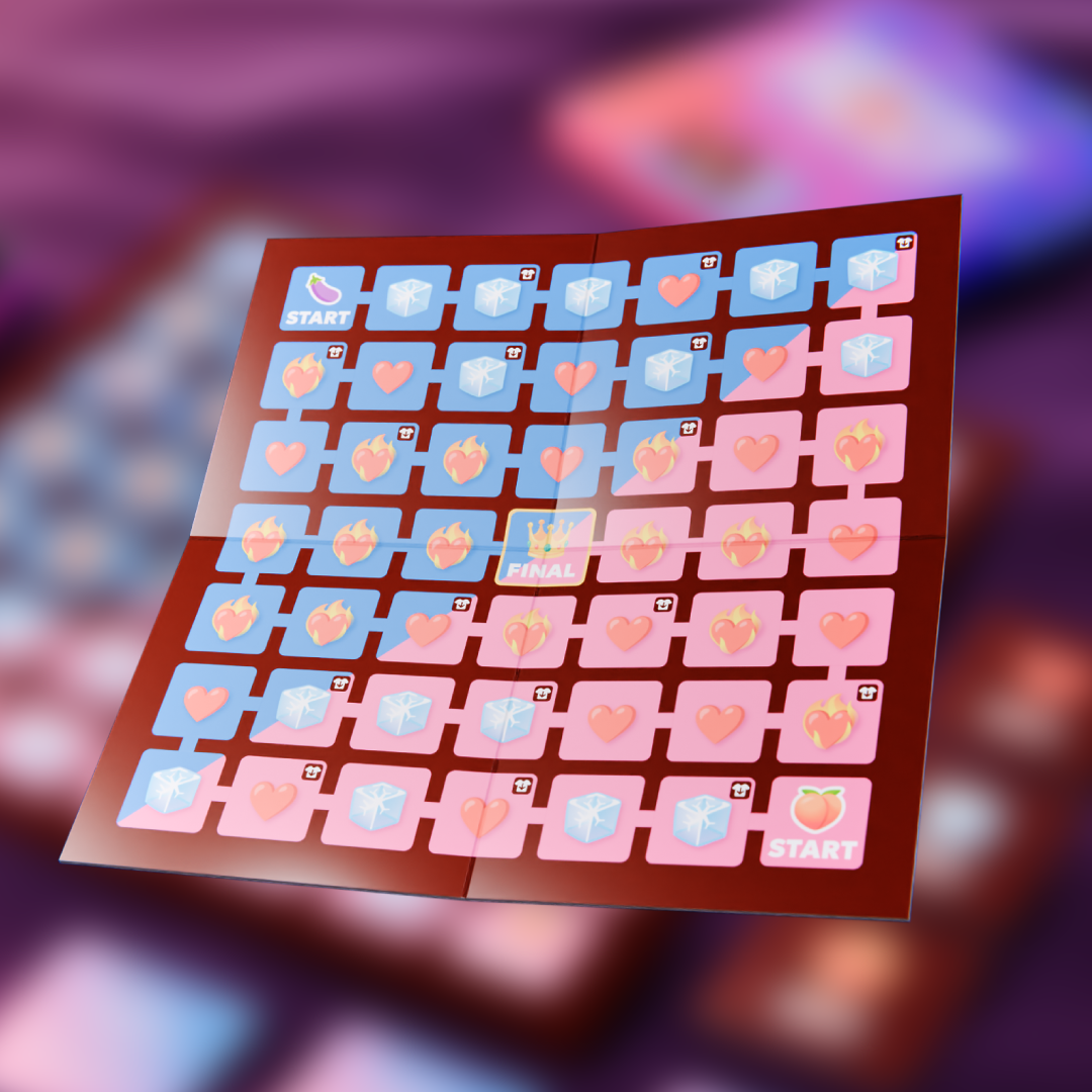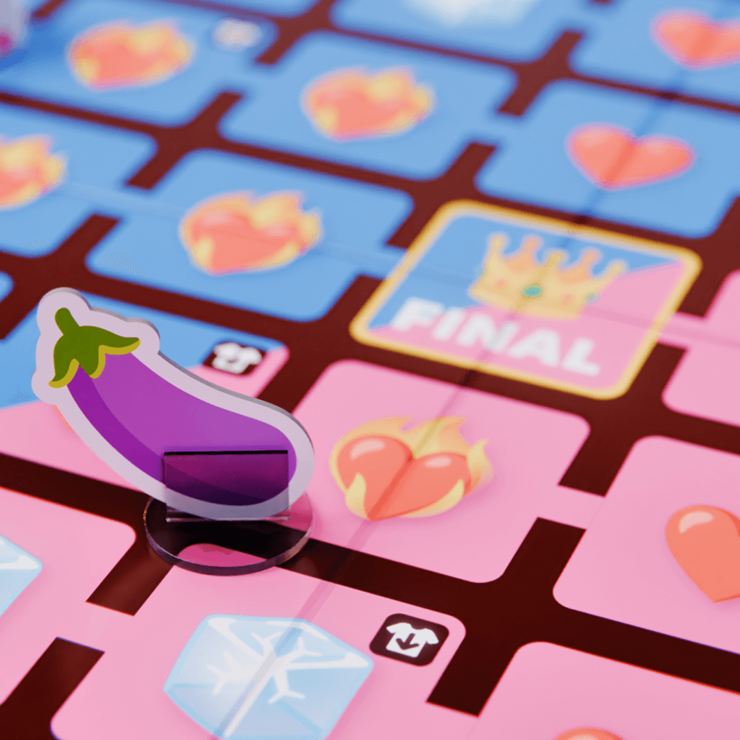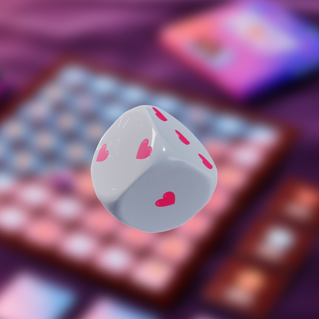 Hoďte láskyplnú kocku a posuňte svoju figúrku dopredu. Vytiahnite kartu so zodpovedajúcim symbolom, na ktorom ste pristáli, a vyberte si jednu z dvoch výziev. Ak pristanete na políčku so symbolom „odev so šípkou nadol“, vyzlečte si 1 kus oblečenia. Prvý, kto dosiahne „KONIEC“, vyhráva a môže dať partnerovi špeciálnu výzvu.